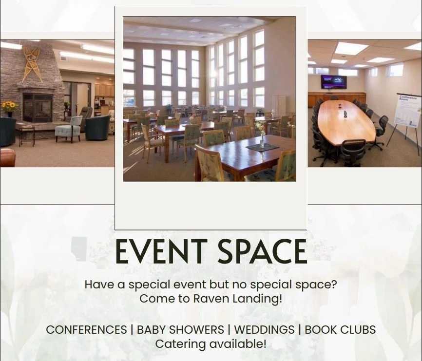 Raven Landing offers event space ranging from conference room to reception hall, providing options for small, medium, and large events. Various sized rooms are ideal for meetings, special events, wedding receptions, and family gatherings.